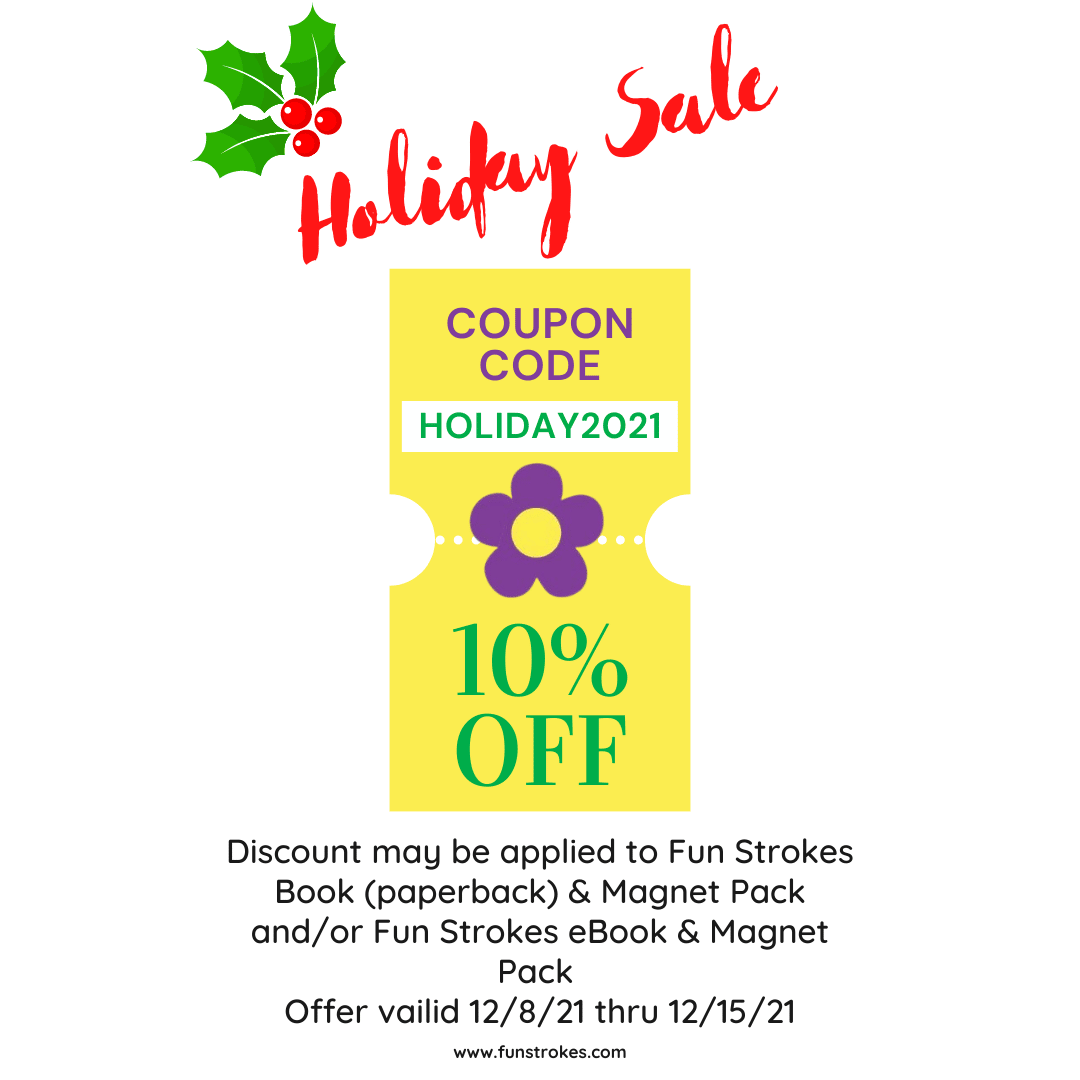 Hello Friend, Just wanted to let you know about the Fun Strokes Holiday Sale which starts today! Enter HOLIDAY2021 at checkout and save 10% on Fun Strokes Book (paperback) and Magnet Pack and/or FunStrokes eBook and Magnet Pack. Fun Strokes makes a great gift for therapists, educators and parents alike. Hurry, offer ends on 12/15/21. Click the link below to shop now! fun-strokes-llc.square.site Or scan the QR code to go directly to the Fun Strokes Store! Happy holidays to you and yours! Linda...
